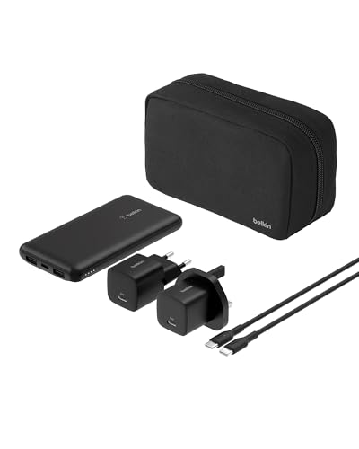 Belkin Portable Charger, 5-in-1 Power Bundle with 10000 mAh Power Bank, 2-25W USB-C Charging Block, EU/UK Plug, 60W USB-C Cable, and Travel Pouch – Fast Charging for Multiple Devices, Compact Design