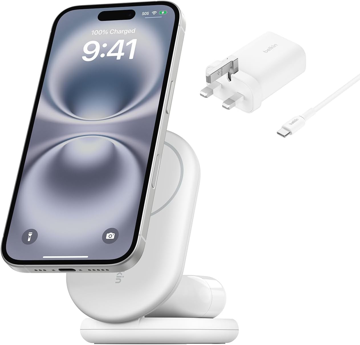 Belkin BoostCharge 3-in-1 Wireless Charging Stand with Qi2 15W, MagSafe Compatible Fast Charger for iPhone 17, Air, 16, 15, 14, 13, 12 Series, PixelSnap, AirPods, Apple Watch (PSU included) - White