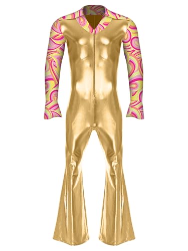 Vxuxlje Mens Shiny Metallic Hippie Jumpsuit Long Sleeve Bell Bottoms Pants Dance Bodysuit for Disco Party Gold 4XL