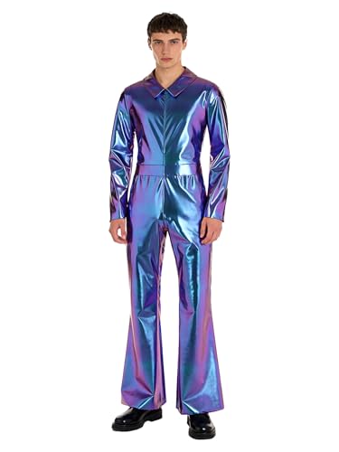 Kaerm Men's Metallic 70s Disco Costume Lapel Flare Sleeve Bell Bottom Jumpsuit Rave Dacne Outfits Blue L