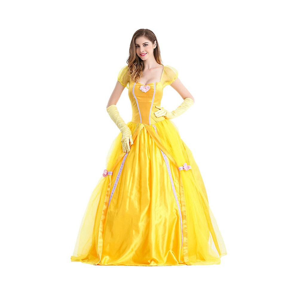 Women Belle Dress with Gloves Adult Princess Fancy Dress Up Outfits Halloween Party Carnival Costume Fairy Tale Beauty and The Beast Cosplay Stage Performance Dance Yellow Long Gown S