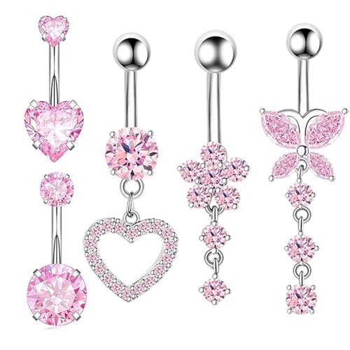 JeryWe 8Pcs Belly Button Bars Navel Belly Button Piercing Surgical Stainless Steel Cute Pink CZ Heart 14G Clicker Belly Bar Piercing Dangly Blue Navel Belly Ring For Women Pink