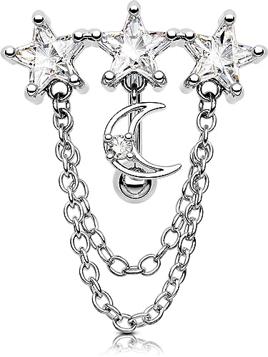 OUFER 14G Reverse Belly Bars Dangle Top Mount Belly Button Bar 316L Surgical Steel Star Moon Chain Big Clear CZ Navel Rings Piercings Jewellery Women