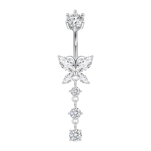 CIZME 925 Sterling Silver Belly Bar 14G 8mm Navel Barbell Belly Button Bar Ring with Butterfly dangle CZ Piercing Jewellery