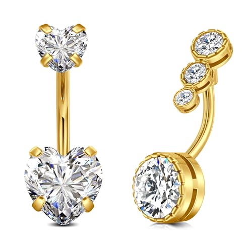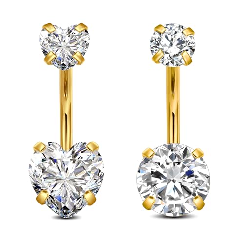 FECTAS 2pcs Belly Bar 10mm Gold Belly Button Bar Heart Diamond Belly Ring Stainless Steel 14G Navel Bars Piercing Jewellery for Women