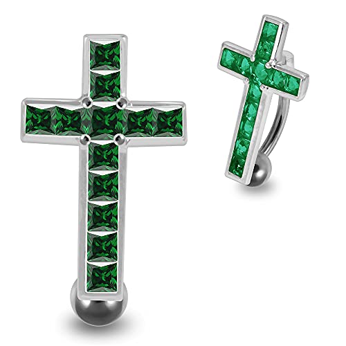 MONSTER PIERCING Dark Green CZ Stone Movable Cross Reverse Bar 925 Sterling Silver Belly Bar Piericng