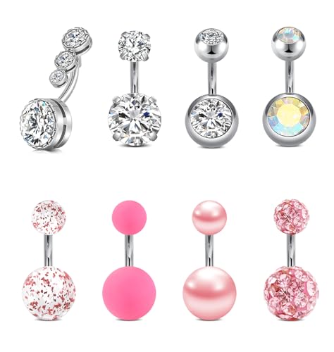FECTAS 8pcs Short Belly Bar Pack 6mm Belly Button Bars Set Stainless Steel Belly Button Piercing Navel Belly Rings Piercing Jewellery 14G Silver Pink