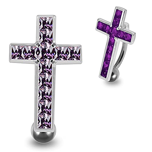 MONSTER PIERCING Purple CZ Stone Movable Cross Reverse Bar 925 Sterling Silver Belly Bar Piericng