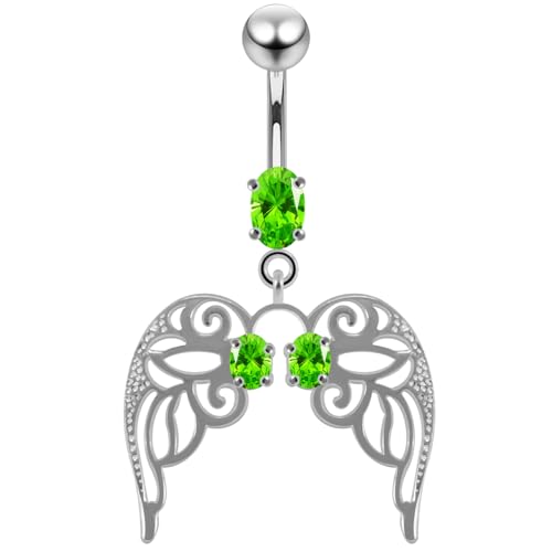 AZARIO London Light Green CZ Stone Cut Out Angle Wing Dangling Design 925 Sterling Silver Belly Bar Piercing