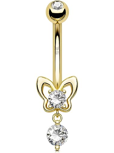OUFER 14G 9ct Solid Gold Dangle Belly Bar Butterfly Dangly Belly Button Bars AAA+ CZ Navel Ring Piercing Barbell Body Jewellery Women Gift
