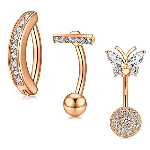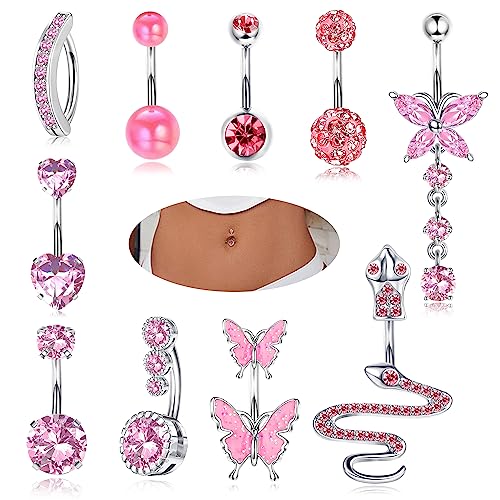 YADOCA 10Pcs 14G Belly Button Bars for Women Surgical Steel Pink Belly Bar CZ Butterfly Snake Clicker Navel Rings Belly Piercing Set Body Piercing Jewellery