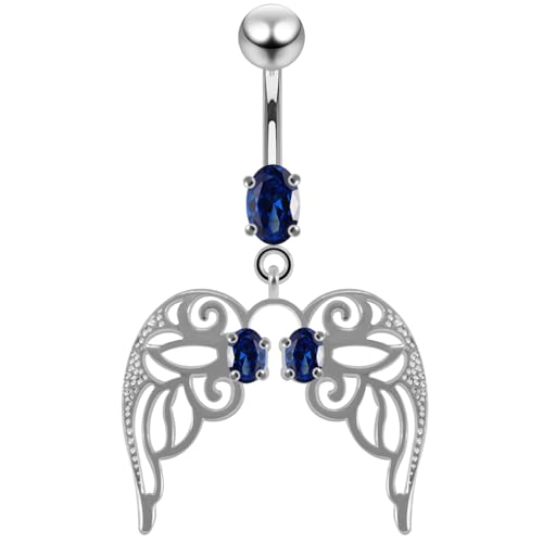AZARIO London Dark Blue CZ Stone Cut Out Angle Wing Dangling Design 925 Sterling Silver Belly Bar Piercing