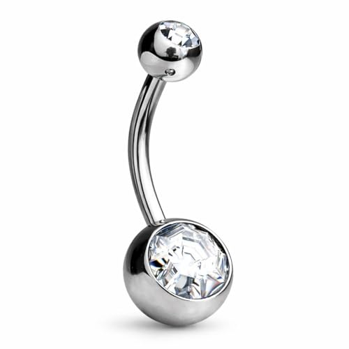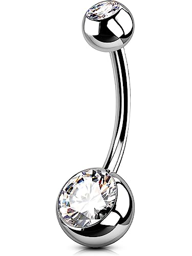 Jewel Barrel Crystal Belly Button Bar - Silver 14G Surgical Steel Navel Ring for Belly Button Piercing - Body Piercing Jewellery with Double Crystal Balls - Hypoallergenic & Durable