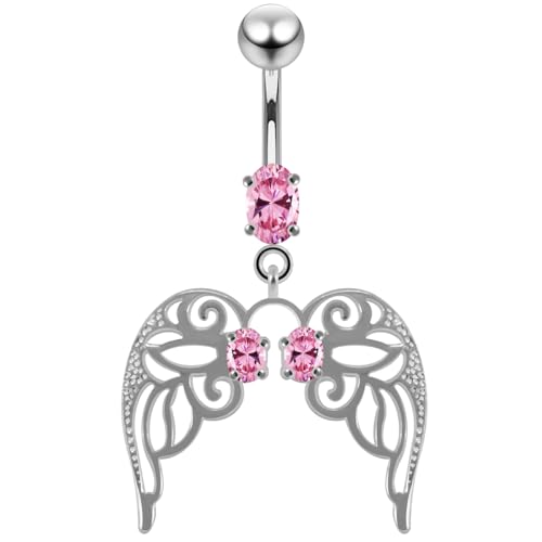 AZARIO London Pink CZ Stone Cut Out Angle Wing Dangling Design 925 Sterling Silver Belly Bar Piercing
