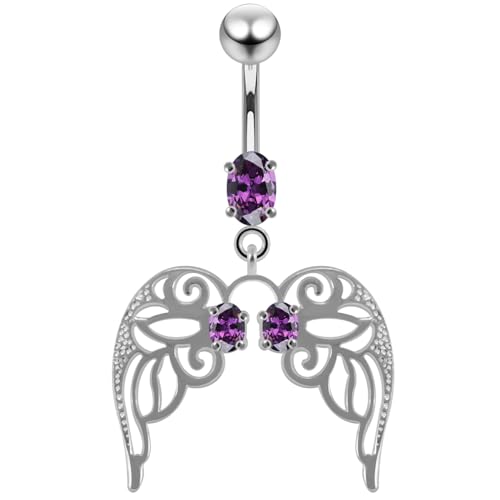 AZARIO London Purple CZ Stone Cut Out Angle Wing Dangling Design 925 Sterling Silver Belly Bar Piercing