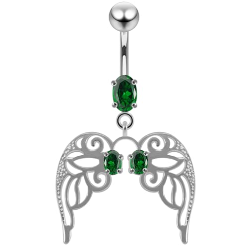 AZARIO London Dark Green CZ Stone Cut Out Angle Wing Dangling Design 925 Sterling Silver Belly Bar Piercing