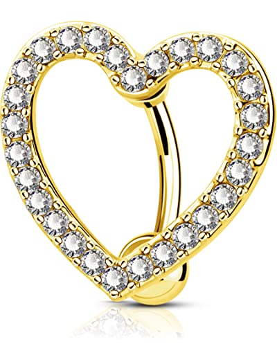 OUFER 14G Reverse Belly Bars Gold Heart Belly Button Bar Piercings 316L Surgical Steel Clear CZ Navel Rings Barbell Body Jewellery for Women Men