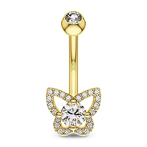 OUFER 14G 9ct Solid Gold Belly Bar Butterfly Belly Button Bar AAA+ CZ Navel Ring Piercing Barbell Body Jewellery Women