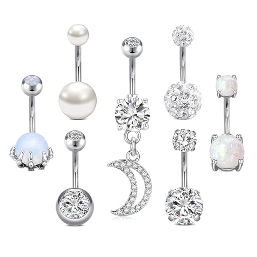 Firtink 7Pcs Belly Button Bars Stainless Steel Belly Button Ring Set Pearl Diamond Belly Piercing Navel Bar Belly Button Ring 14 Gauge Navel Ear Bars Piercing Jewellery