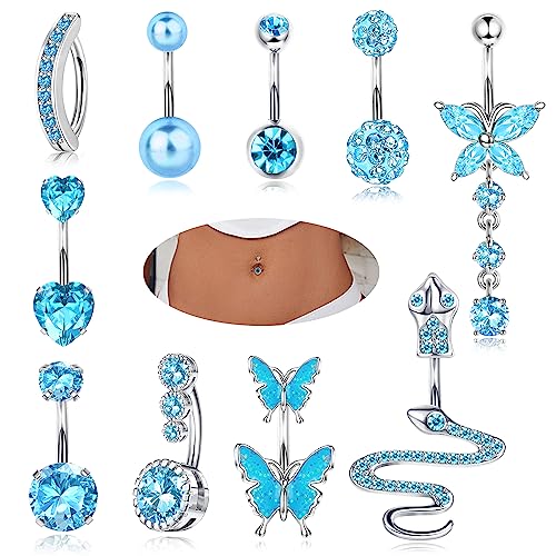 YADOCA 10Pcs 14G Belly Button Bars for Women Surgical Steel Blue Belly Bar CZ Butterfly Snake Clicker Navel Rings Belly Piercing Set Body Piercing Jewellery