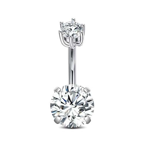 OUFER 14G Reverse Belly Bar Surgical Steel 316L Dangle Lotus Navel Ring CZ Clear 12 mm Piercing Bananabells Silver Long Body Barbell Jewelry for Women