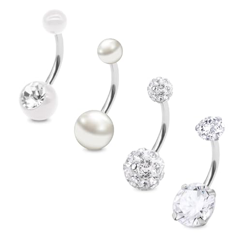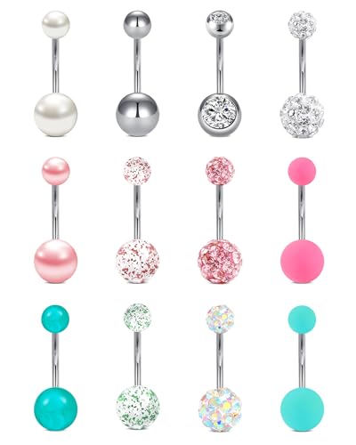 FECTAS 12pcs Long Belly Bar Pack Belly Button Bars Set Belly Button Rings Navel Bars 12mm Surgical Steel 14G Piercing Jewellery Crystal Pearl