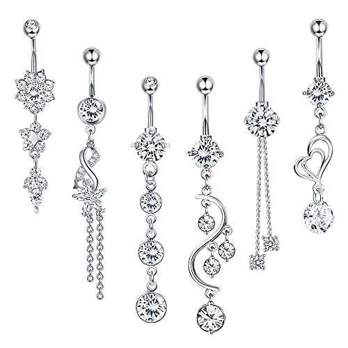 Kakonia 6Pcs Belly Button Bar for Women 14G Dangle Belly Bar 316L Surgical Steel CZ Navel Barbell Body Piercing Jewelry 10mm