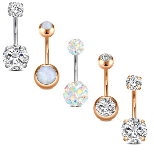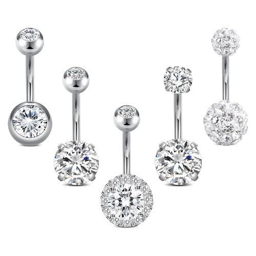 Crdifu 5Pcs Belly Button Bars, Silver Belly Bar, 316L Stainless Steel Belly Bars, 14 Gauge 10mm Belly Button Piercing, Basic Navel Jewellery Barbell Set Clear Cubic Zirconia, Everyday Essentials Pack