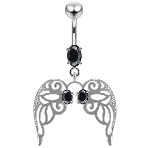 AZARIO London Black CZ Stone Cut Out Angle Wing Dangling Design 925 Sterling Silver Belly Bar Piercing