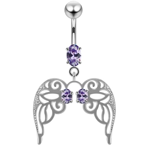 AZARIO London Lavender CZ Stone Cut Out Angle Wing Dangling Design 925 Sterling Silver Belly Bar Piercing