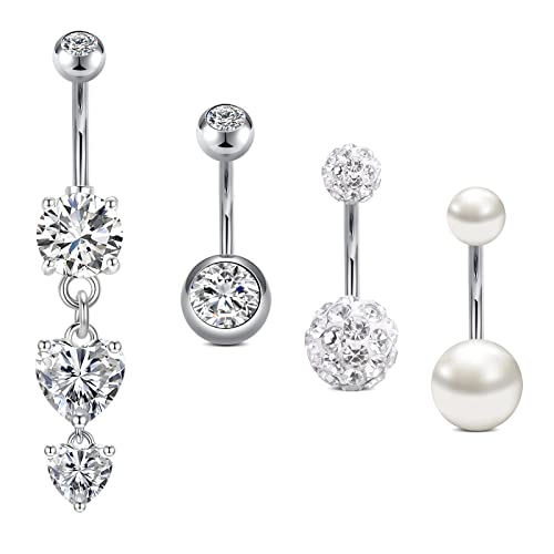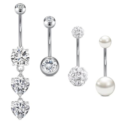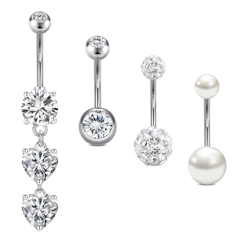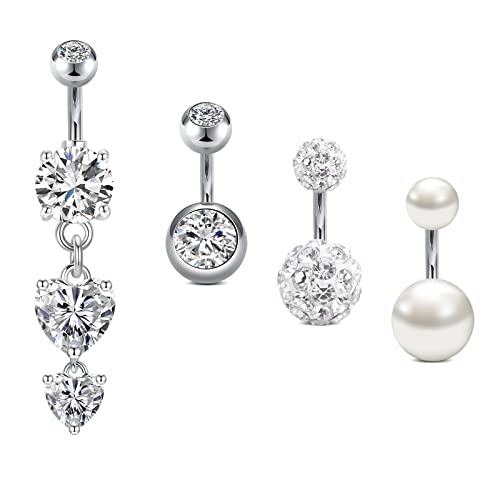 Crdifu 4pcs Belly Bars 14G Silver Belly Button Rings 6/8/10/12/14mm Stainless Steel Navel Piercing Jewellery