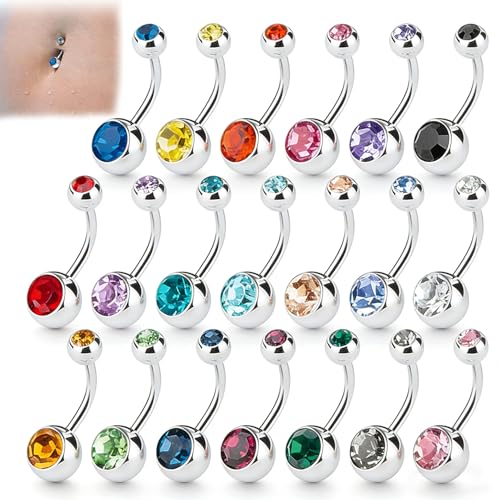 Belly Button Bars with Double Gems, Amaza 20 Colors Stainless Steel Navel Piercing Jewelry Belly Bars Set with a Storage Pouch ,14G,1.6mm*10mm