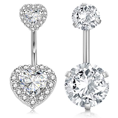 OUFER 14K White Gold Heart Belly Bars Solitaire Cubic Zirconia Belly Button Rings Navel Bars Body Piercing Jewellery in 14Gauge 1.6mm