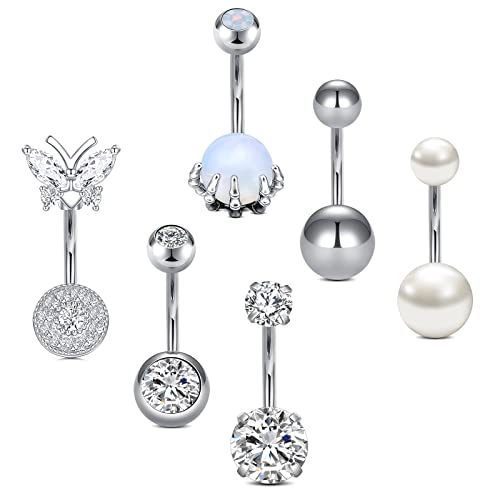 Crdifu 4pcs Silver Belly Bars 10mm 14G Belly Navel Button Rings Surgical Steel with Synthetic Opal CZ Stone Piercing Jewellery