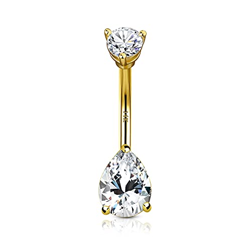 CM Crareesi Mania Teardrop Belly Button Bars 14K Solid Gold Navel Piercing Jewellery Cubic Zirconia Belly Rings 14G Yellow Gold Navel Rings for Women