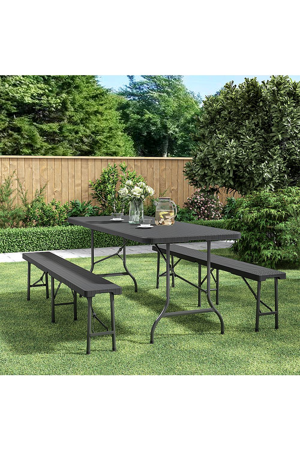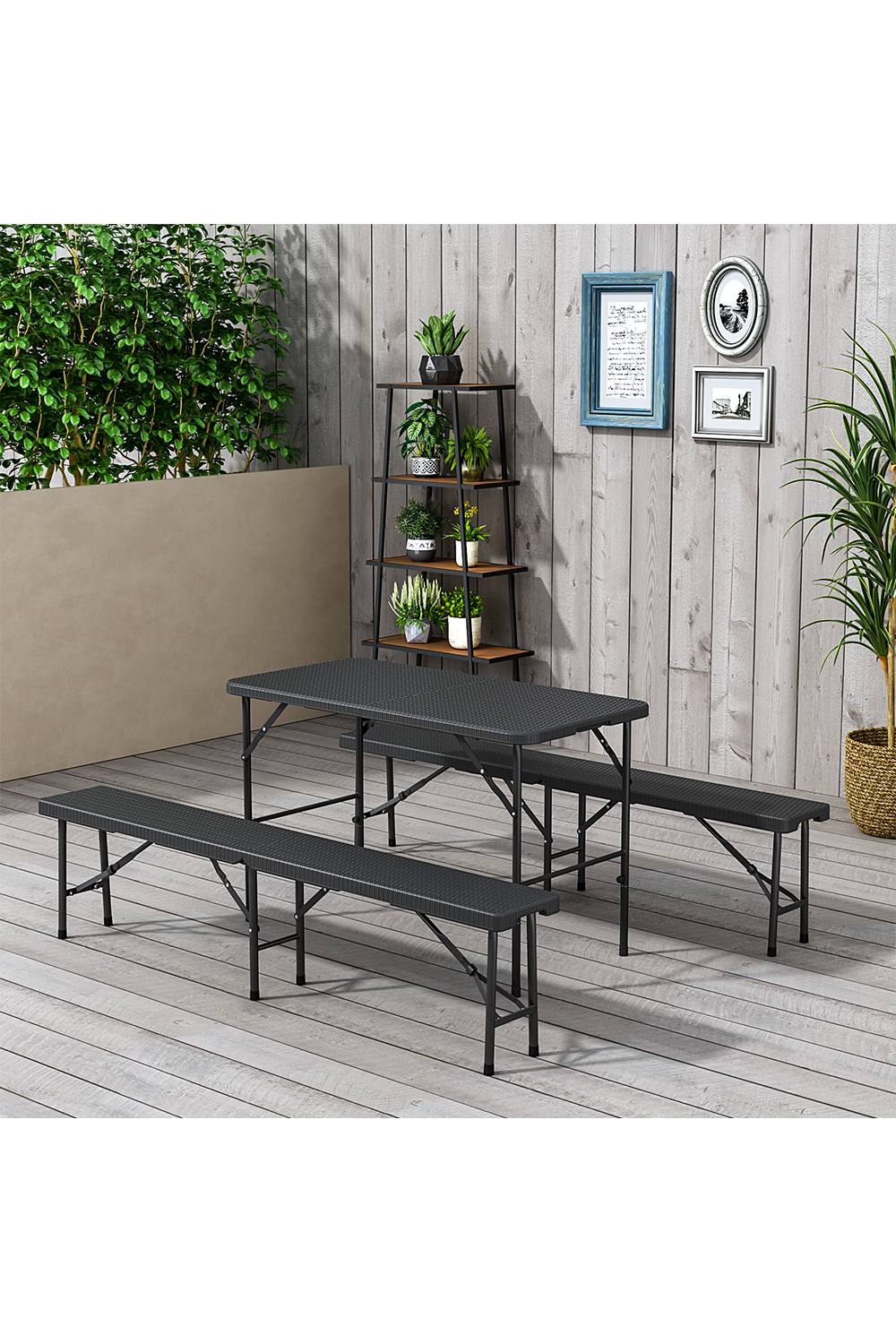 Living and Home 3-Piece Rattan Plastic Outdoor Camping Folding Table Bench Set in Black