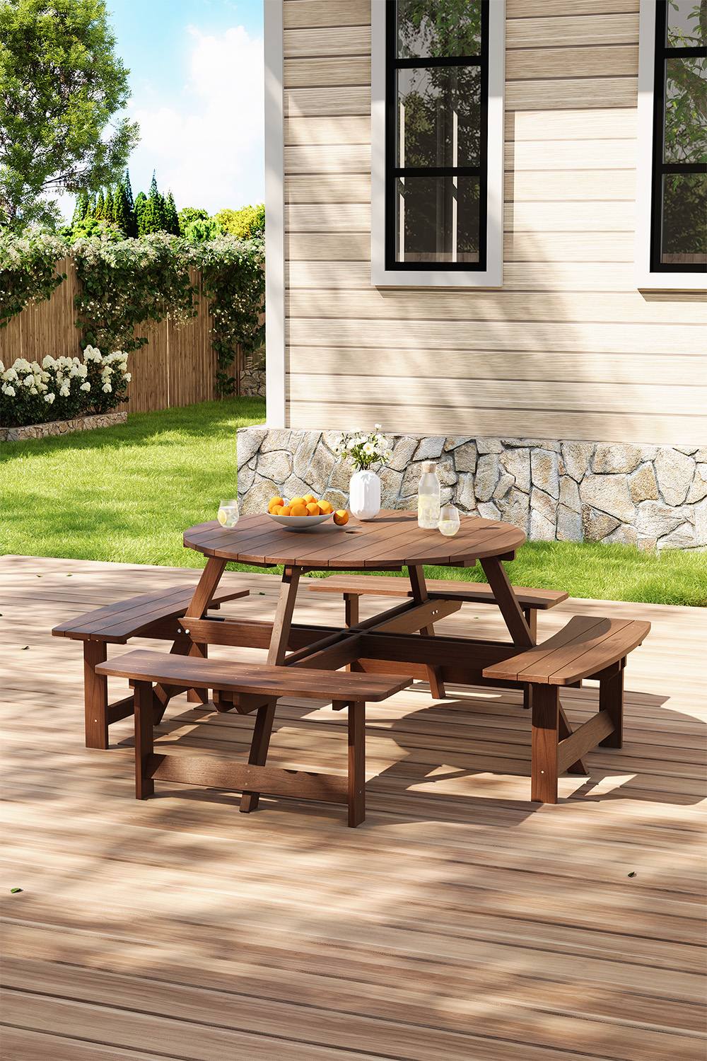 Living and Home 8-Person Round Wood Picnic Table and Bench Set in Brown
