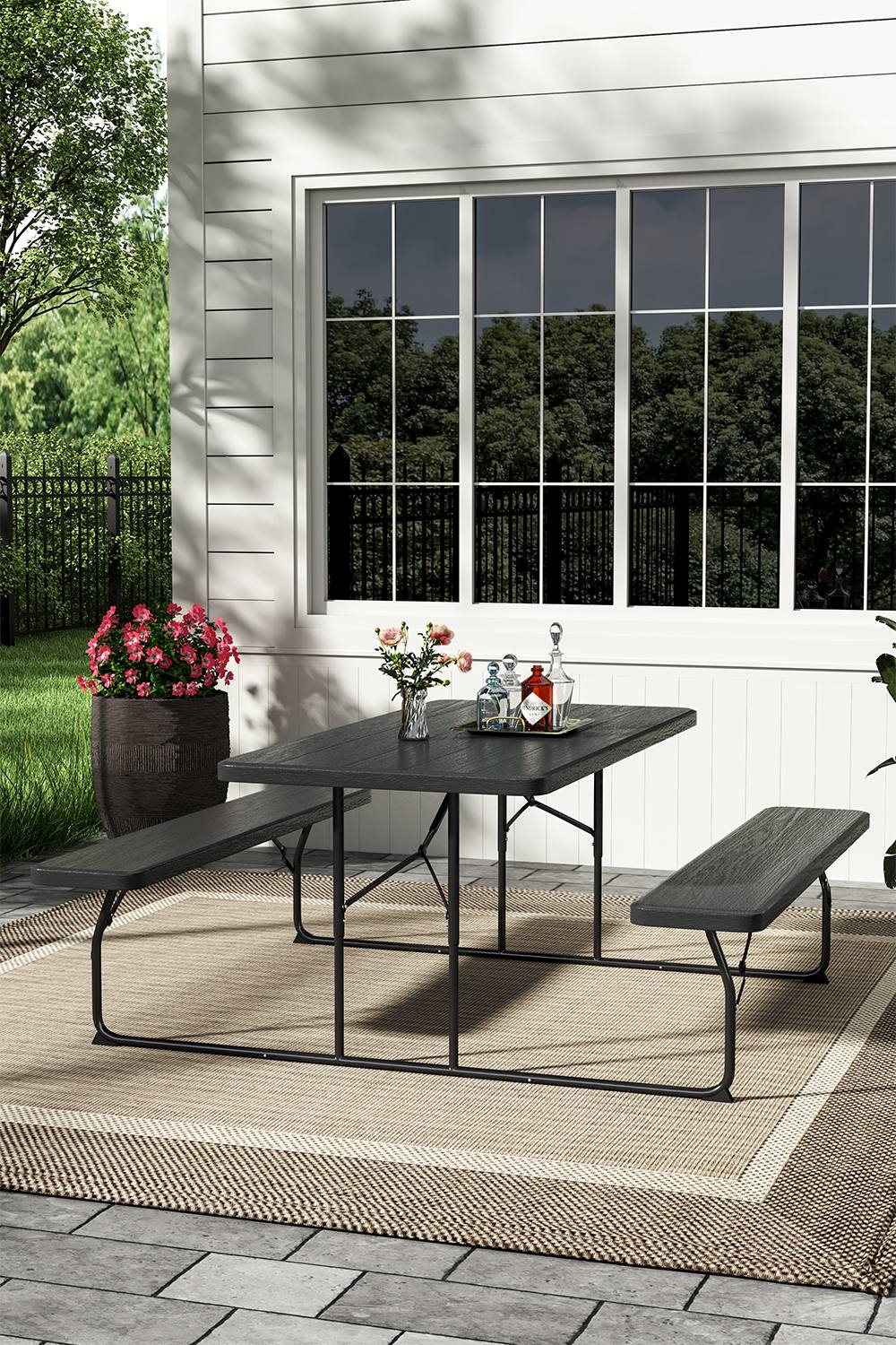 6ft Folding Table & Folding Bench Seat Set - Functional, Easy-to-Fold-and-Store Furniture for Indoor and Outdoor Use with Wood Grain Pattern, Heavy-Duty Black Plastic Surfaces & Steel Frames