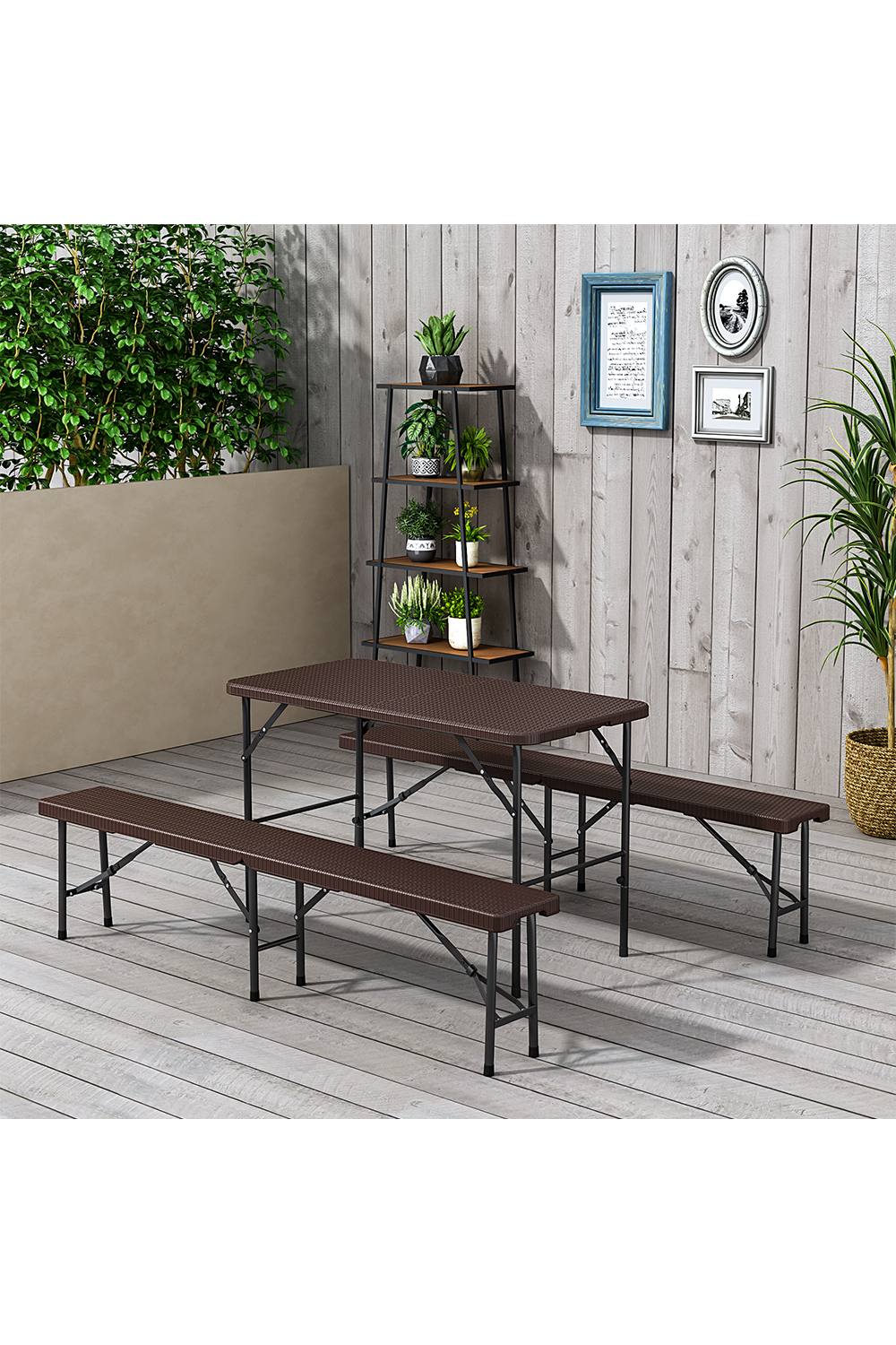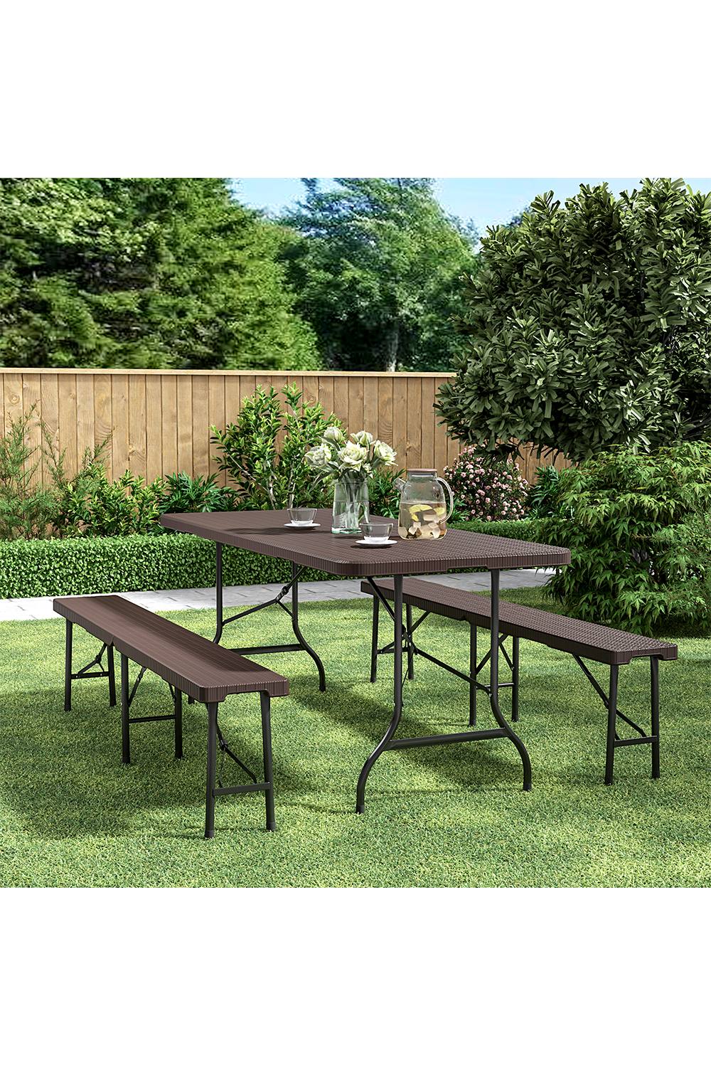 Living and Home 3-Piece Rattan Plastic Outdoor Camping Folding Table Bench Set in Brown