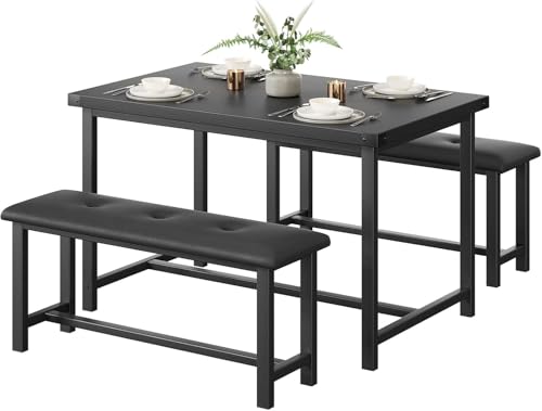 Kitchen Dining Table and 2 Bench Set, Garden Bench Home Furniture Set Dining Room Furniture, Solid Table & Sturdy Metal Frame Industrial, Black