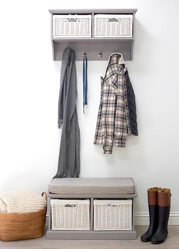 Statement Furniture Tetbury Hallway Set with White Wicker Storage Baskets | Small Bench Seat 76W x 46H x 40D cm, Hanging Shelf Coat Rack 77W x 43H x 28D cm | Fully Assembled (grey)