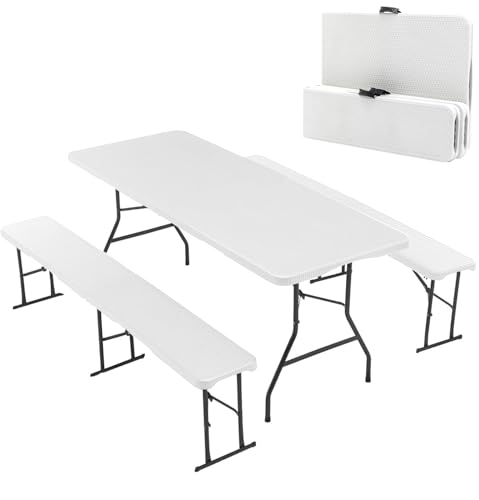 BIRCHTREE Folding Foldable Table Bench Set 6FT 1.8M Heavy Duty HDPE Steel Legs Portable Outdoor Camping Garden Picnic BBQ Party White