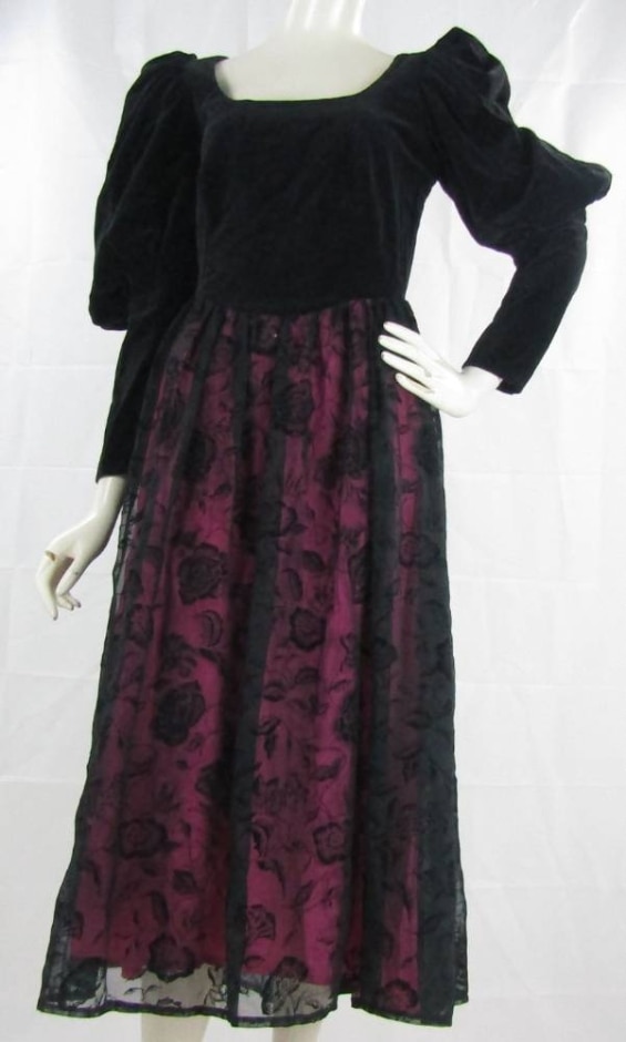 Vintage Berkeley Square Puff Sleeve Velvet Midi Dress Black Size: 14