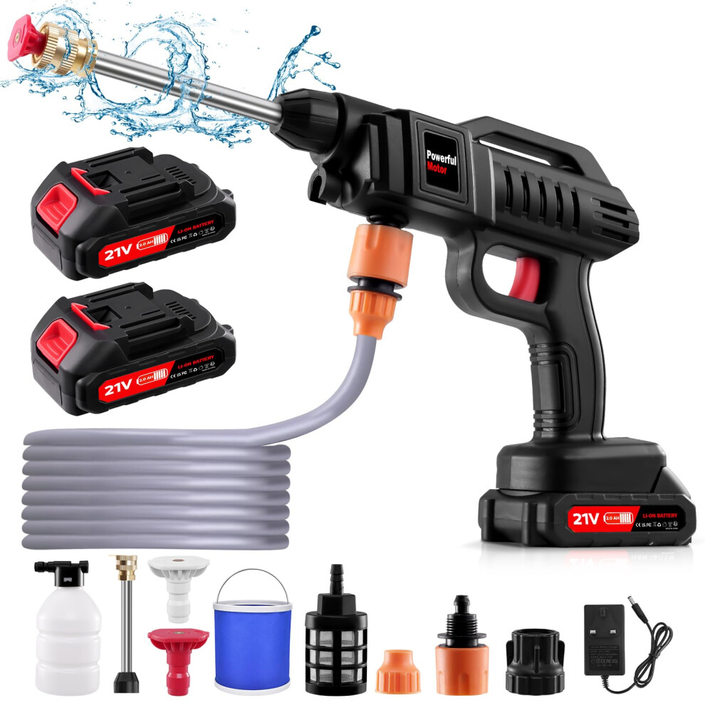 21V Cordless Pressure Washer with 2Pcs 3000mAh Battery, Portable Pressure Washer Gun, 6-in-1 Nozzle, 5m Hose & Tap Connector, Portable Jet Washer
