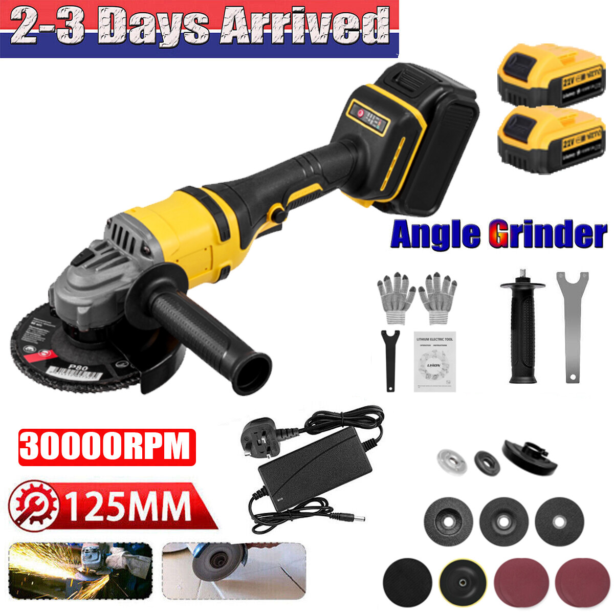 125mm Cordless Angle Grinder Brushless with 2 Battery & Charger & Disc Kit - UK