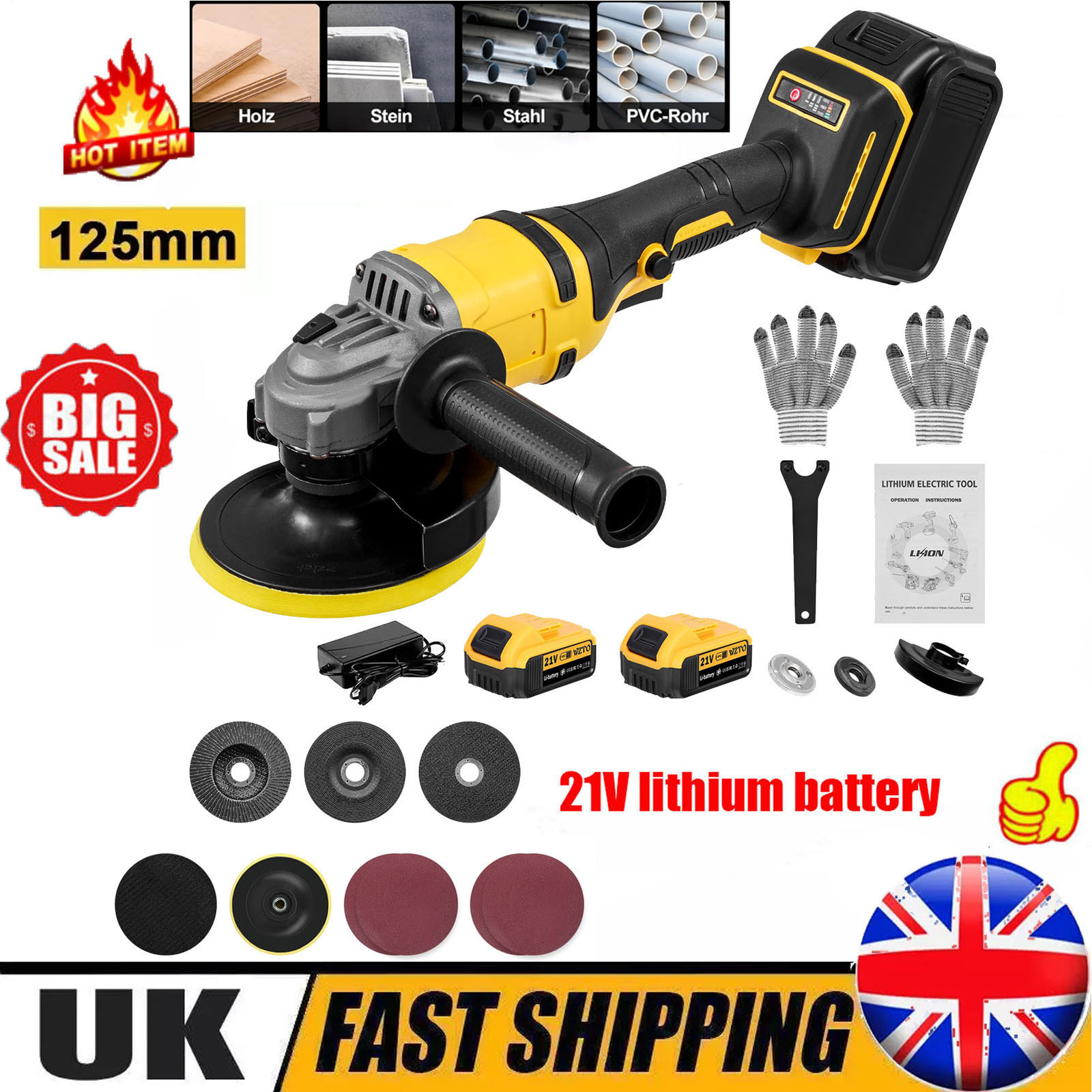 Cordless Angle Grinder with Battery and Charger & Disc Kit Power 1500W Sander UK