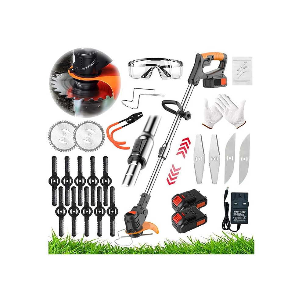 Cordless Strimmer With 2 Battery And Charger - 21V Telescopic Lightweight Grass Trimmer Battery Grass Trimmer With 10 x Metal Blades & 2x Circular Saw Blade, 24cm Cutting Width Garden Lawn Trimmer