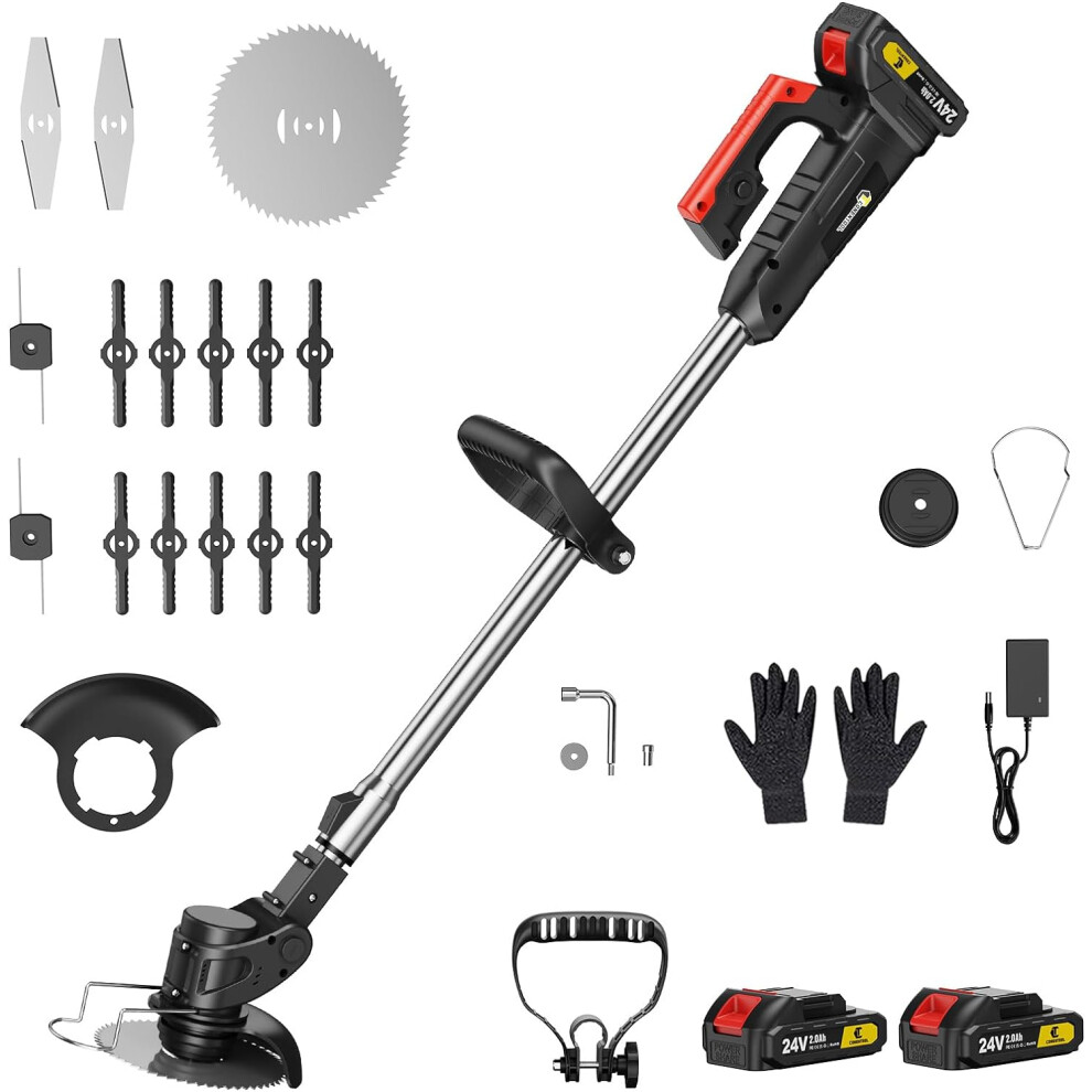 (Black) 24V Cordless Strimmer - Grass Trimmers with 2 * 2000mAh Batteries and 15 Blades, Garden Strimmers, Light Weight/Quick Charging/ 4 Types Blades