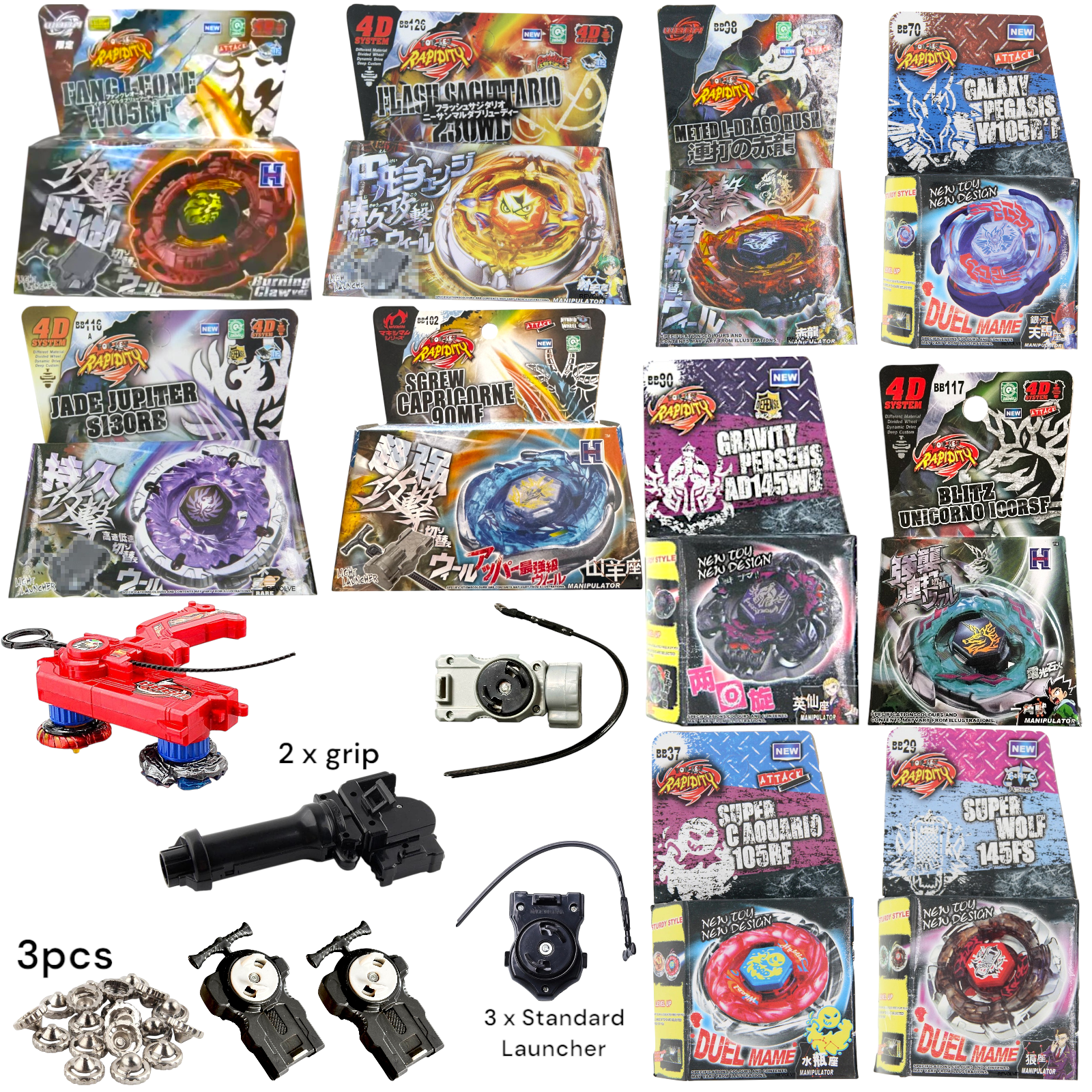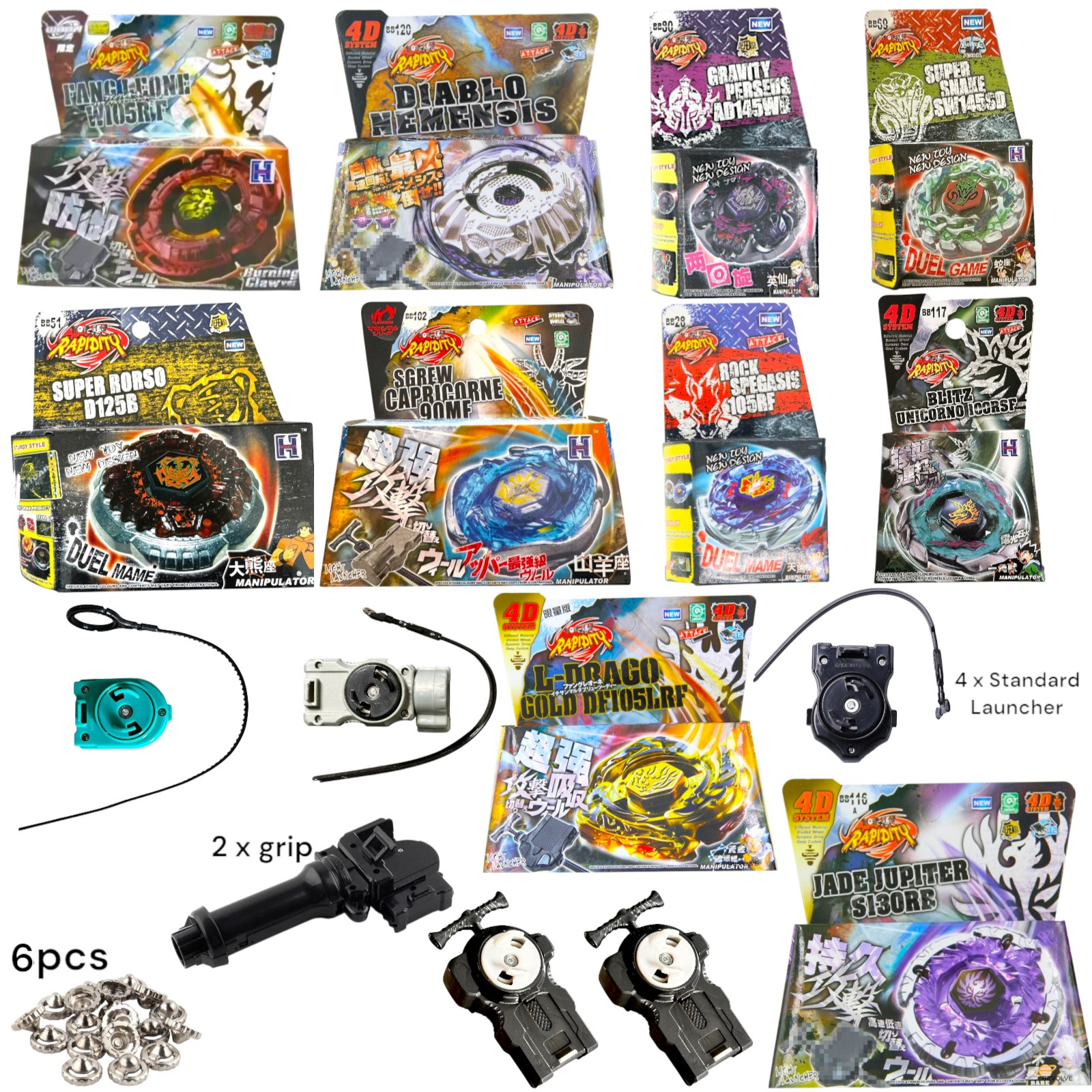 BEYBLADE 10x Metal Fusion Tops Bey + 6 Launchers + 4x Grip Handle Fight Set