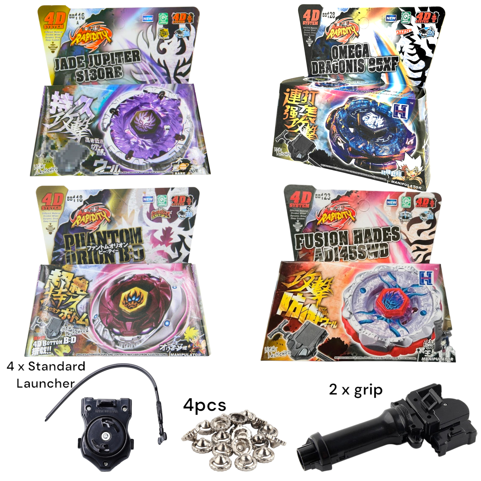BEYBLADE 4x Metal Fusion Tops + 4x Launchers + 2x Grips Xmast Pack | Burst X